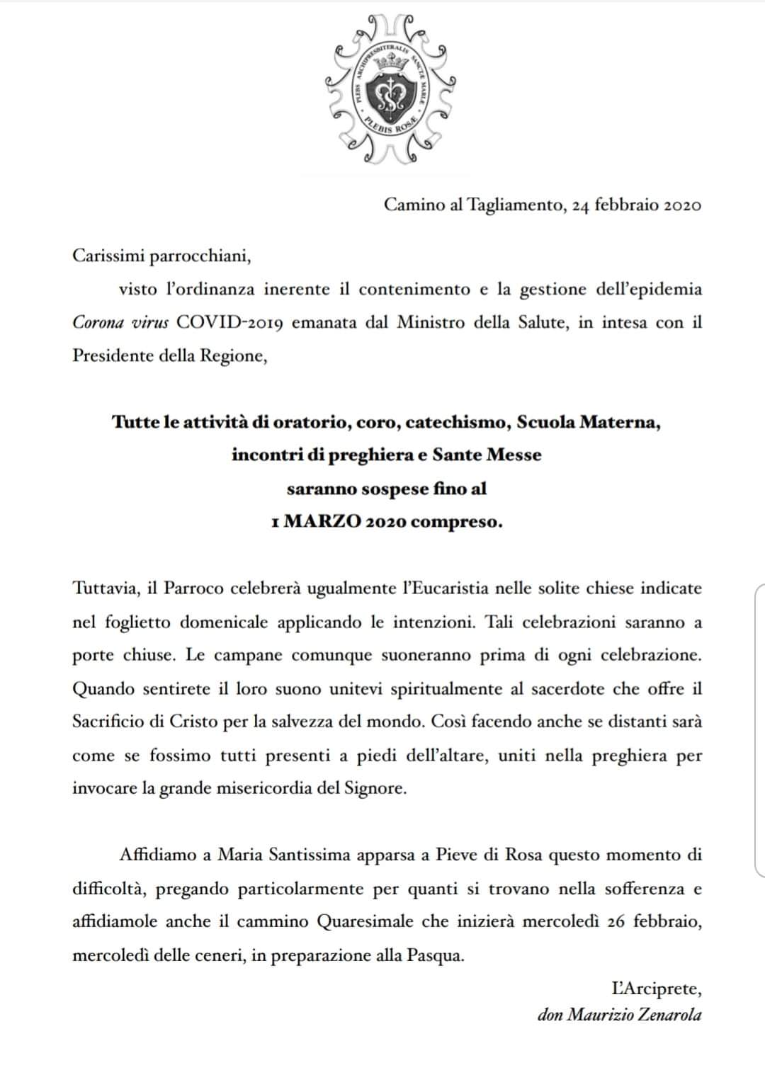 Tutte le attività di oratorio, coro, catechismo, Scuola Materna, incontri di preghiera e Sante Messe saranno sospese fino al 1 MARZO 2020 compreso.