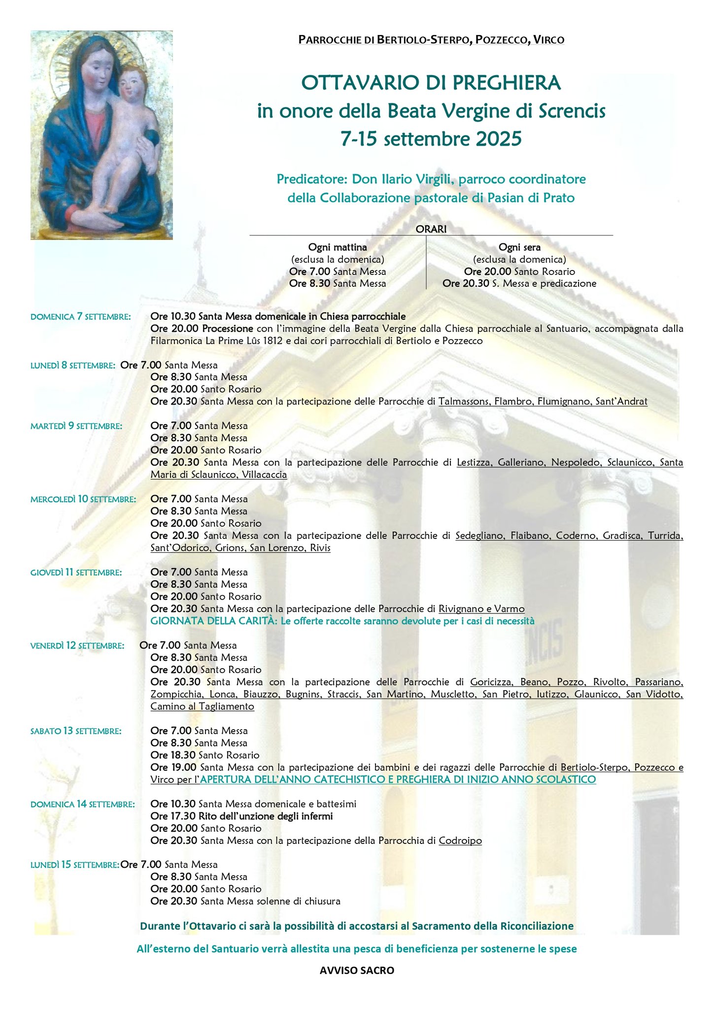 - Ore 19.00 Santa Messa per le parrochie di Bertiolo Sterpo, Pozzecco e Virco, con la partecipazione dei bambini e ragazzi per l’apertura dell’anno catechistico e preghiera di inizio anno scolastico.