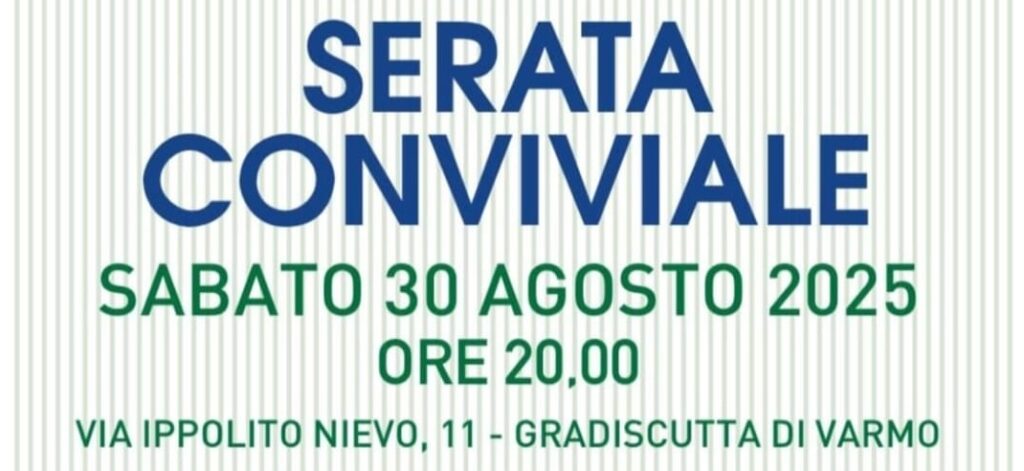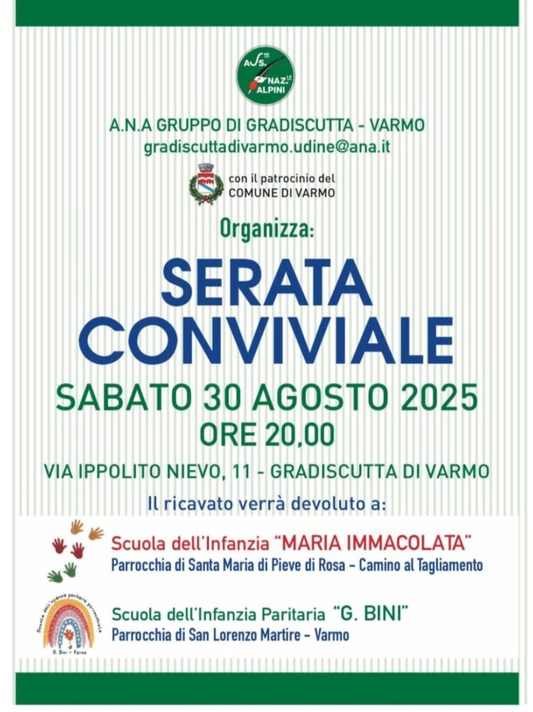 Sabato 30 Agosto alle ore 20.00 serata conviviale a Gradiscutta di Varmo, via Ippolito Nievo 11, organizzata dal gruppo ANA di Gradiscutta-Varmo.